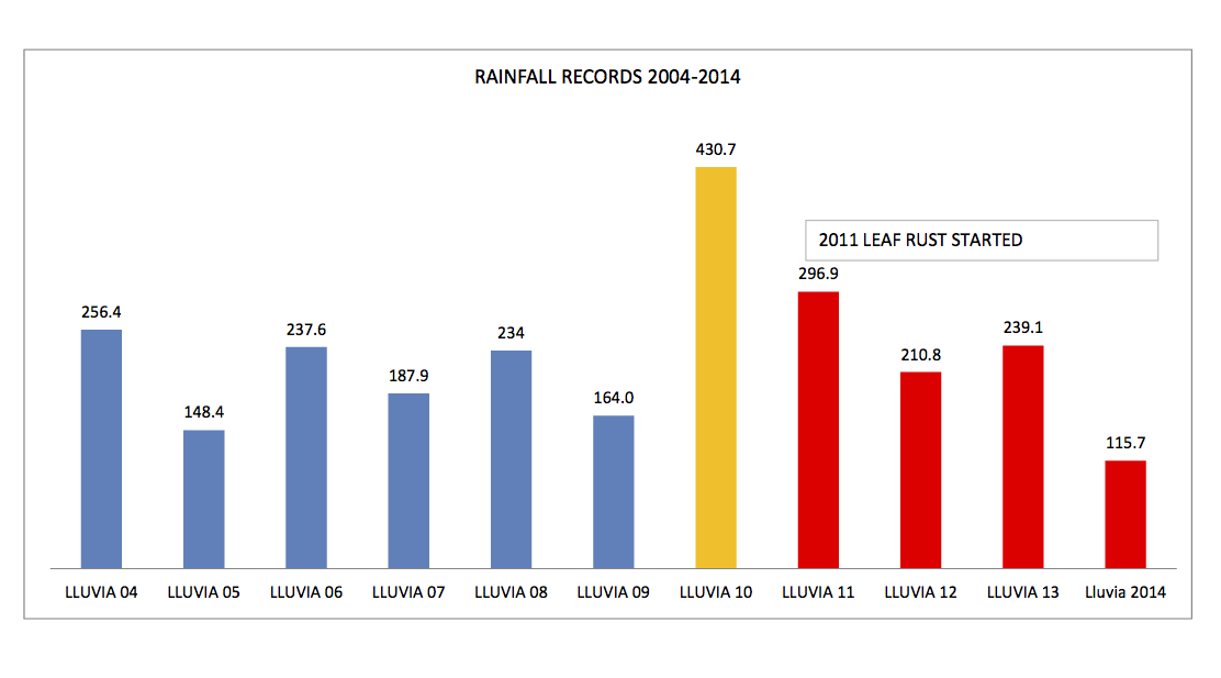 Raul Pérez from La Soledad farm, in Acatenango municipality, in Chimaltenango department (Central Zone of Guatemala) shared the farm’s rainfall patterns for the past five years. According to him, the accumulative for this year until end of July is 109 mm more than last year. He also said that 4,000 mm of rain registered in 2010, one year before the leaf rust outbreak, and since then, an average of 2,100 mm has been the constant.